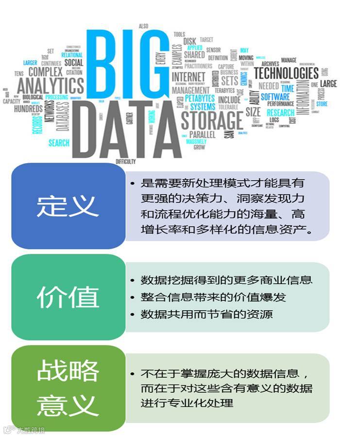 说完数据挖掘了,我们来说说大数据。随着我们产生的数据越来越多,大数据领域在最近五年成为了非常火热的方向。首先我们来看看大数据的定义,大数据(big data)是指无法在可承受的时间范围内用常规软件工具进行捕捉、管理和处理的数据集合,是需要新处理模式才能具有更强的决策力、洞察发现力和流程优化能力来适应海量、高增长率和多样化的信息资产。我在这里跟大家分享的是我对大数据的看法。我认为大数据的价值是在于能通过数据挖掘的技术得到更多的商业信息,我们能够通过整合这些信息带来更大的价值爆发,我们通过数据共用而节省了更多的资源。而大数据的战略意义不仅仅是因为能掌握庞大的数据信息,更重要的是是能通过对这些信息进行专业化的处理,从而获得更高的价值。