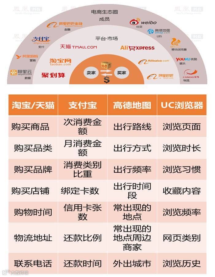 有的枯燥是吧,这里来举个例子。这张图是阿里的生态布局。核心是他的交易业务,与交易相关的应用包括:聚划算、淘宝、天猫、阿里巴巴等等,那么外围的应用呢,包括阿里云、支付宝、微博、高德地图、UC浏览器等等。可能有的朋友不理解为什么阿里要做这样的布局,那么我们可以看一些比较明显的数据关联。下面这个表格里是数据是每个用户分别在不同的网站或应用中产生的数据,但如果我们是用同一个账号登录就可以做这个用户的画像了。