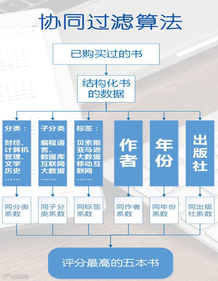 今天的内容专业性更强,所以数学本科毕业的我上来就要讲算法了。跟大家解释一下刚刚视频里出现的算法,协同过滤算法。这里是举例讲一下算法的逻辑,真正使用的过程中,比这个复杂的多。每一个用户买过的书,都有很多属性,亚马逊会把这些属性进行结构化数据存储,这些属性包括分类、子分类、标签、作者、年份、出版社等等。然后根据这本书里属性,推荐出每个属性相同的书各五本,为每本书设置该属性系数和排名,最后将所有属性系数加权后进行排序,评分最高的五本书就会被推荐出来。这是一个很典型的数据挖掘在电子商务上的应用。