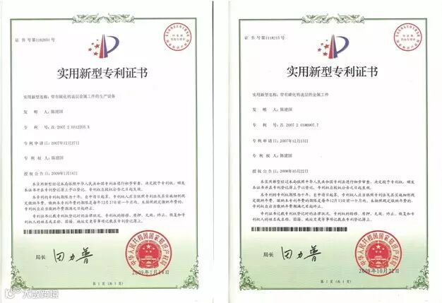 自有知识产权:专利两项、商标证书、专有工艺技术。
