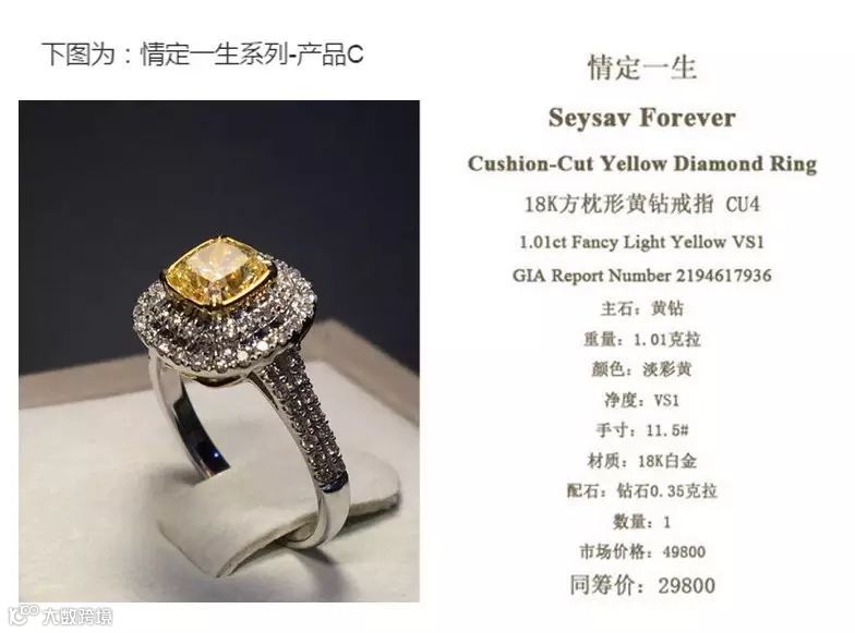 情定一生系列-产品C。市场价:49800、众筹价:29800。;主石:黄钻、重量:1.01克拉、颜色:淡彩黄、净度:VS1、手寸:11.5#、材质:18K白金、配石:0.35克拉。【额外回报:奢尚终身会员享有9折优惠, 产品售后及服务。】(售罄)