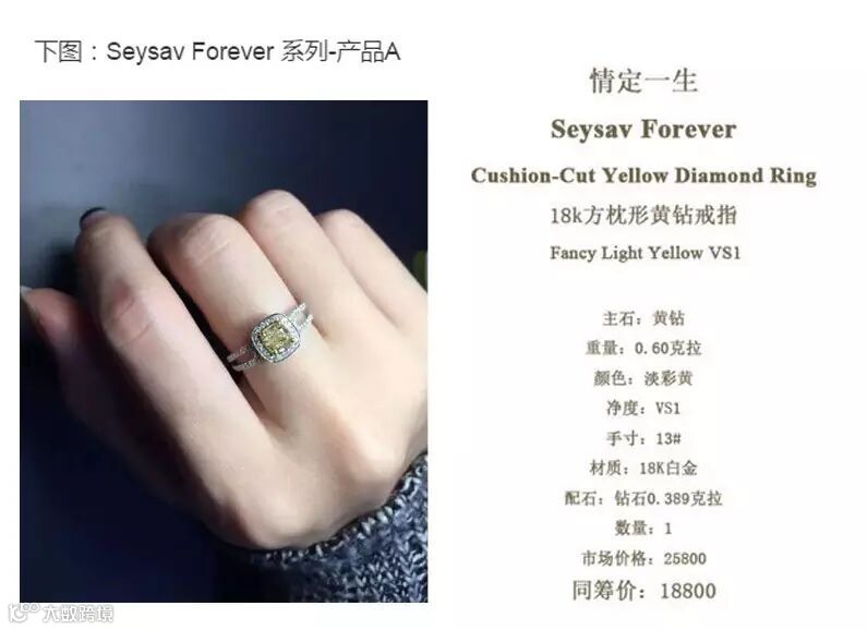 Seysav Forever 系列-产品A。市场价:25800、众筹价:18800。;主石:0.6克拉、颜色:淡彩黄、净度:VS1、手寸:13#、材质18K白金、配石:0.398克拉。【额外回报:奢尚终身会员享有9折优惠, 产品售后及服务。】