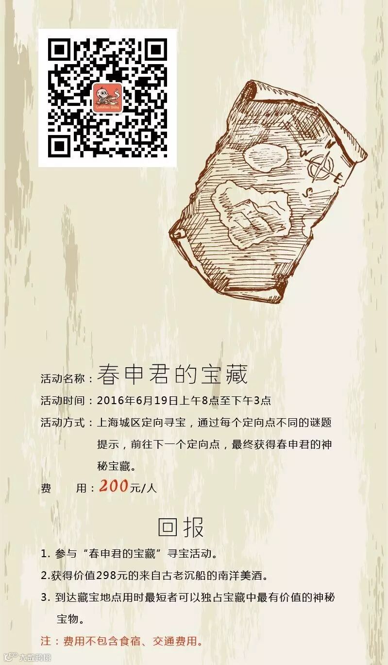 4. 在指定时间段,到达起点即可出发。从出发开始计时,到达藏宝地点用时最短者可以独占宝藏中最有价值的神秘宝物,所有参与者均可获得价值298元的来自古老沉船的南洋美酒。