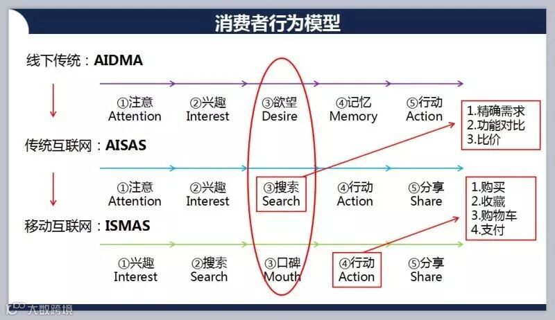 线下传统模式和传统互联网模式,一般客户的切入点都是先从注意开始,下单之前的中间有个步骤,而传统模式,是欲望,通过购买欲望,那么传统互联网是需要通过搜索