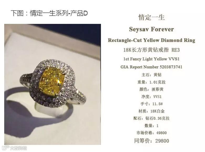 情定一生系列-产品C。市场价:49800、众筹价:29800。;主石:黄钻、重量:1.01克拉、颜色:淡彩黄、净度:VS1、手寸:11.5#、材质:18K白金、配石:0.35克拉。【额外回报:奢尚终身会员享有9折优惠, 产品售后及服务。】(售罄)