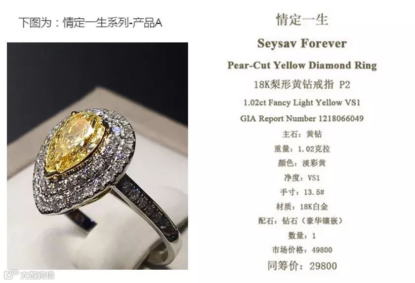 情定一生系列-产品A。市场价:49800、众筹价:29800。;主石:黄钻、重量:1.02克拉、颜色:淡彩黄、净度:VS1、手寸:13.5#、材质:18K白金、配石:钻石(豪华镶嵌)。【额外回报:奢尚终身会员享有9折优惠, 产品售后及服务。】