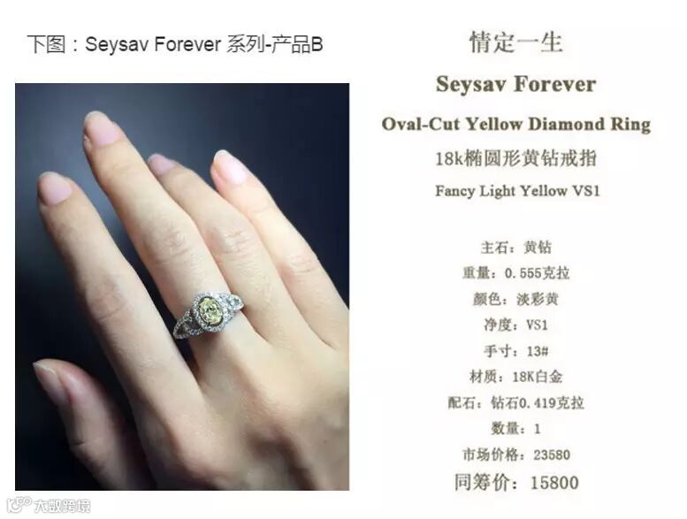 Seysav Forever 系列-产品B。市场价:23580、众筹价:15800。;主石:0.555克拉、颜色:淡彩黄、净度:VS1、手寸:12#、材质18K白金、配石:0.419克拉。【额外回报:奢尚终身会员享有9折优惠, 产品售后及服务。】