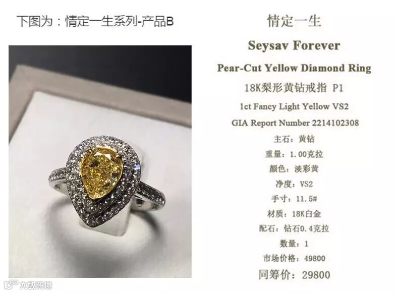 情定一生系列-产品B。市场价:49800、众筹价:29800。;主石:黄钻、重量:1.00克拉、颜色:淡彩黄、净度:VS2、手寸:11.5#、材质:18K白金、配石:0.4克拉。【额外回报:奢尚终身会员享有9折优惠, 产品售后及服务。】