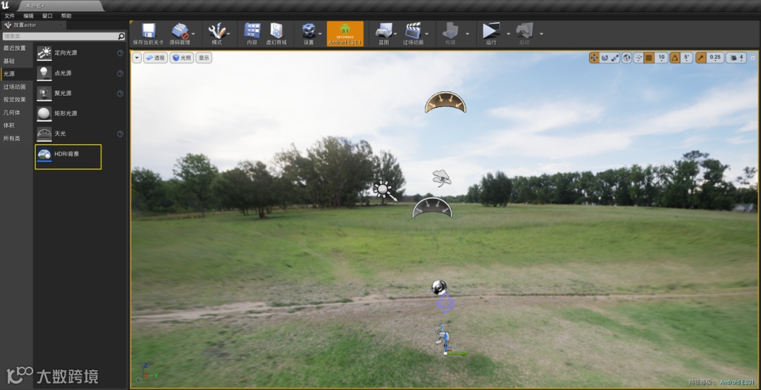 Skylight通常作为环境光的整体照亮,即可以调整默认的天空环境去使用,也可以选择HDRI之类的环境贴图来处理光照。Skylight既有360°环绕光照,又具备开销低的特性。非常适合在ES3.1的开发环境下使用。
