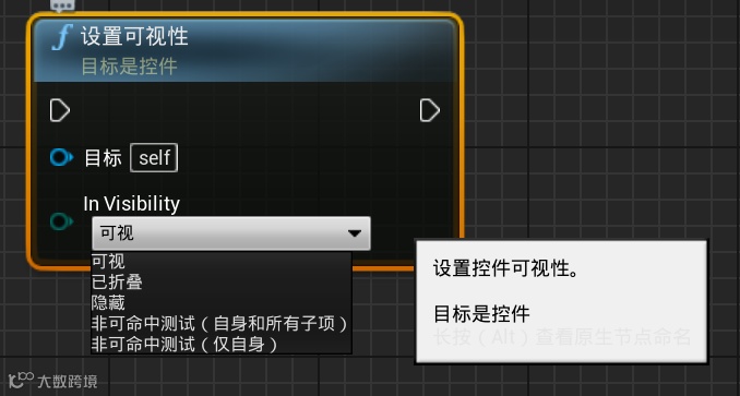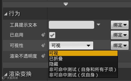 可视性:可以对按钮的可视性设置不同的状态,同时也可以结合“设置可视性”节点,在出发相关按钮之后改变按钮的可视性,对用户的操作做出相应的反馈。