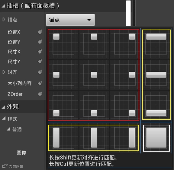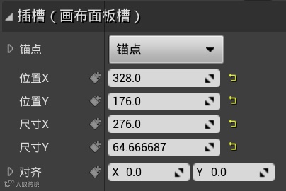 在选择好锚点之后,可以看到插槽参数中有“位置X”和“位置Y”,这两个便是控件与选择锚点的相对位置关系。
