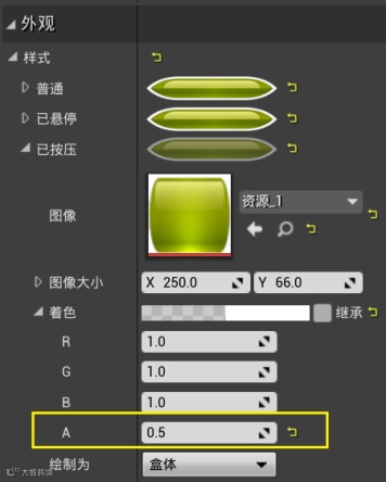 实践举例1:展开普通、已悬停、已按压,各个页面中都有各自具体的参数,一般情况下,我们会使用制作好的UI贴图填充到图像,其它参数保持默认设置。如果是按压触发按钮的功能,我们可以在已按压的样式里找到着色,将RGBA的A通道降低一定的数值,如图2.1.2,这样能够在用户按压按钮时做出一定的反馈。