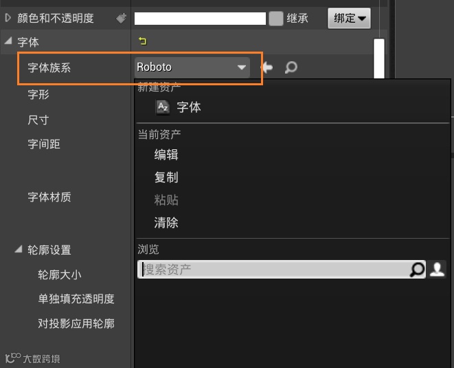 文本控件用于渲染文本。文本控件的具体参数设置都很常规,与按钮控件类似,在此不过多赘述。唯一需要细讲的是字体族系的使用。默认状态下字体族系只有默认的“Roboto”字体,如图2.2.1。如果需要使用指定的字体,需要将字体文件导入UE工程才能使用。