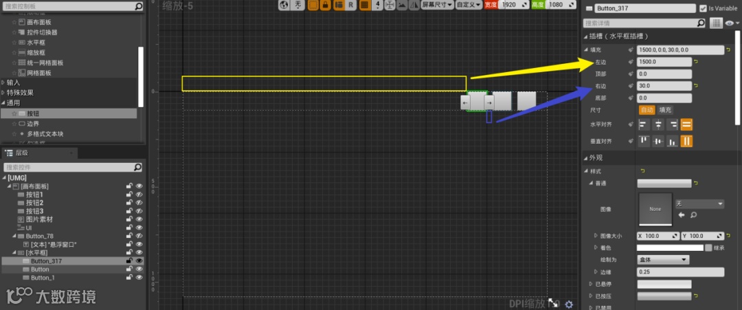 将新创建的水平框里勾选上“大小到内容”,放入按钮,调整按钮尺寸之后,在按钮插槽的参数中,左边就是距离左侧控件的距离,如果是第一个控件,则是与水平框边缘的距离。右边给上一定的数值,这个数值就是和下一个按钮之间的距离,如图2.3.3所示。