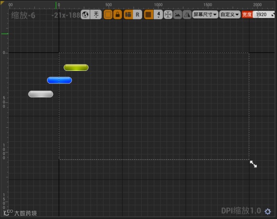 画布的主要作用就是为了调整控件的位置,超出画布之外的控件不渲染。只需要将对应控件拖到工作区即可完成控件的添加。我们将三个按钮依次排列,第一个在画布内,第二个一半在画布内,第三个完全在画布外,我们可以看到图1.3.1和1.3.2的对应效果,画布以外的部分不会显示。