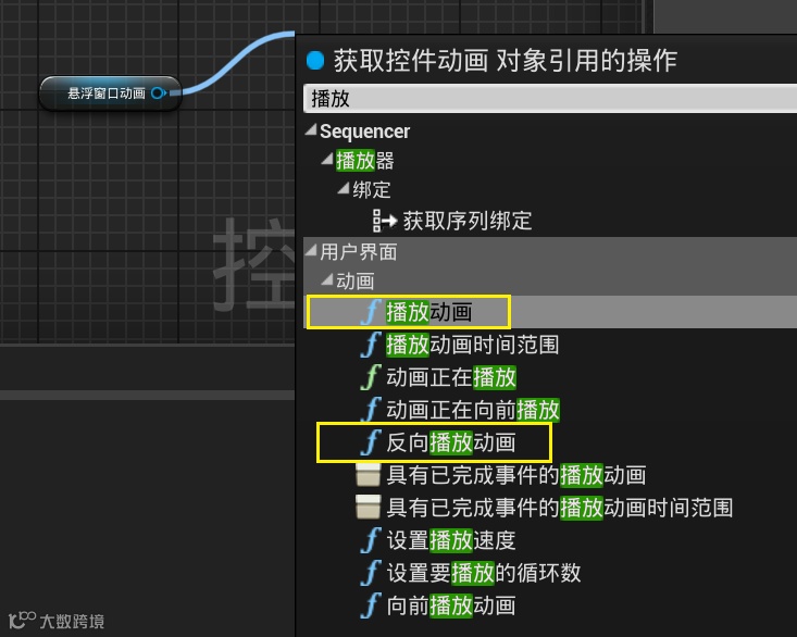 此时再切换到图表页面,在左侧变量下出现了新的动画变量。将动画直接拖到画面中,选择获取动画变量。分别调用出对应的“播放动画”与“反向播放动画”节点,并分别连接到Flip Flop的A与B上。