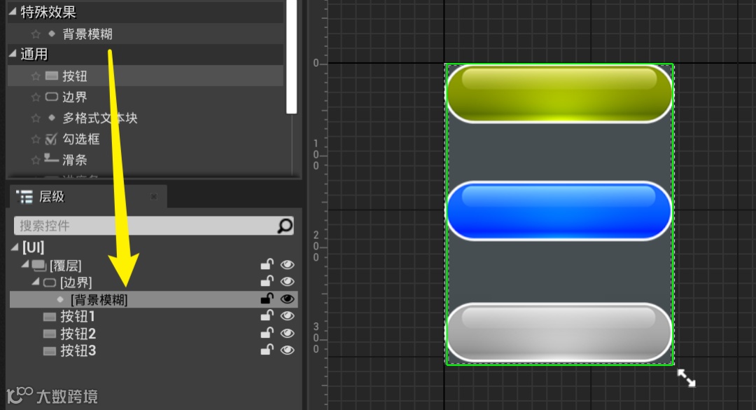 我们还可以将控件列表中的背景模糊加入到边界的子集中,在右侧细节面板中找到模糊强度,把数值拉高,实现一种悬浮卡片模糊的效果。