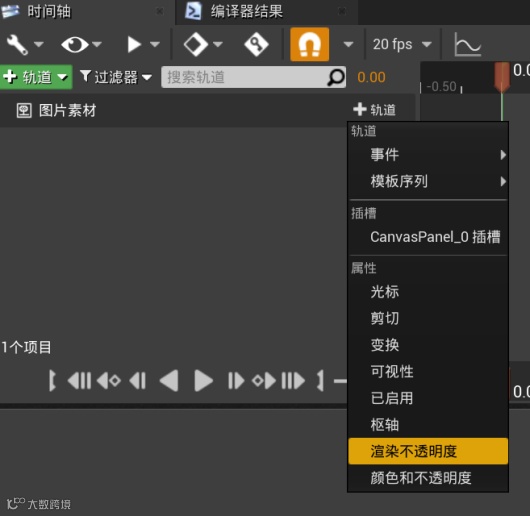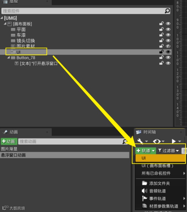 在动画窗口新建动画,选择悬浮窗口的控件蓝图,将悬浮窗口添加到轨道中,如图3.2.2所示。