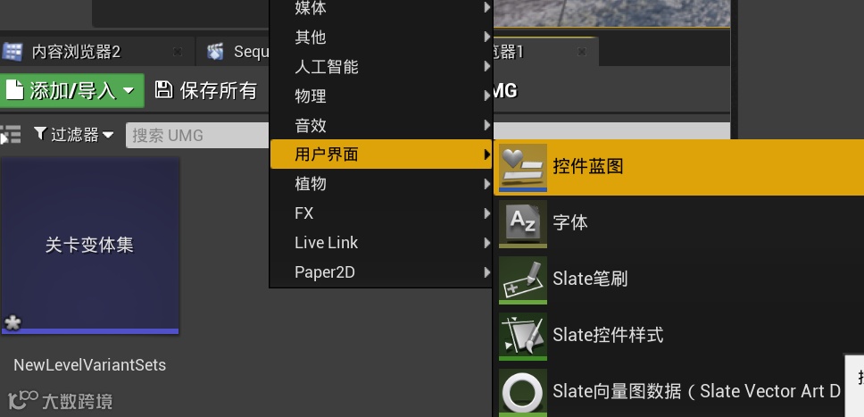 在虚幻引擎里面,可以通过控件蓝图实现UMG的功能。右键点击内容浏览器,在“用户界面”里面选择到“控件蓝图”。