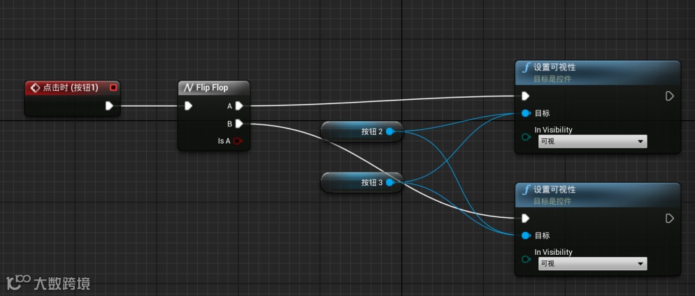 实践举例2:制作一个按钮控制另外两个按钮的隐藏与显示。我们在按钮1的事件属性下选择“点击时”,触发点击事件之后会自动跳转到图表页面。将按钮2与按钮3从变量列表中直接拖入事件图表中,选择获取,如图2.1.7。在按压事件后面使用“Flip Flop”,A输出端链接另外两个按钮的显示,B输出端链接另外两个按钮的隐藏,如图2.1.8。这样便完成一个循环触发的隐藏显示点击交互。