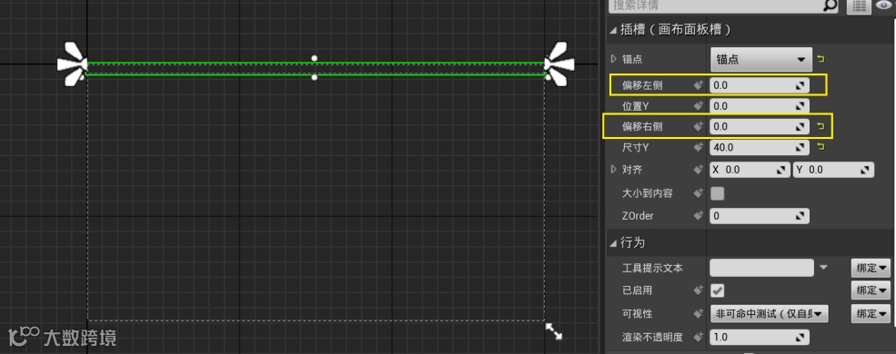 以竖轴向作为锚点适配来举例,位置X是横向相对于锚点的位置;偏移顶部和偏移底部是控件到顶部和底部的距离,调节该参数会使控件发生形变;尺寸X是控件横向的尺寸大小。