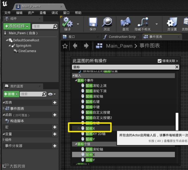 打开Main_pown,进入“事件图表”中。鼠标右键单击空白处调出命令搜索,在鼠标个事件下分别有鼠标X和鼠标Y,将他们调用出来。
