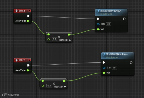 同样从鼠标X的Axis Value 拉出输出端的线,输入float,找到浮点*浮点,输入倍率0.7之后,输出到添加控制器Yaw输入的Val输入端中。鼠标Y也是如此,但倍率需要调整为-0.7,否则上下方向的旋转会与鼠标移动的方向相反。