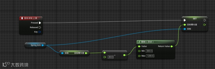 从获取TargetArm Length输出调用浮点-浮点,然后继续输出调用限制(浮点),将浮点限制在300-500的范围内,最后将至输出到设置TargetArm Length(SET)的目标臂长度输入端。