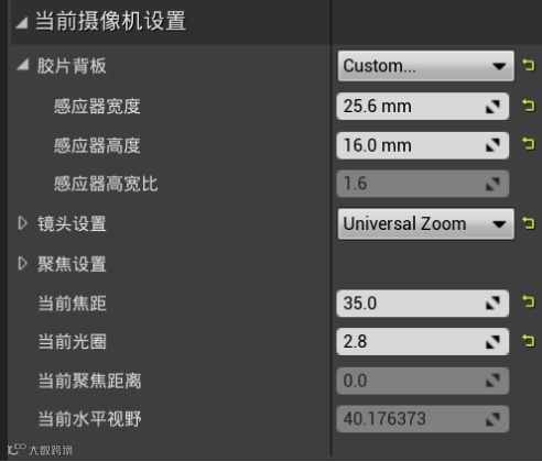 调整弹簧臂组件和摄像机组件的一些基本参数。设置摄像机的基本参数,例如调整相机的画布比例,相机的焦距等等。在项目中所有的画布比例都需要保持一致。例如该项目的画布为2560*1600,那么此处的相机画布比例就设置为25.6:16。