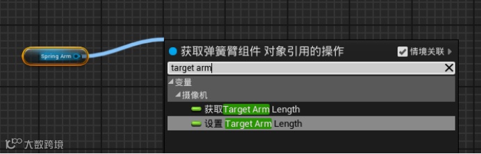 将弹簧臂组件(SpringArm)从左侧直接拖入到空白处,会自动生成一个小的目标控件。从右侧拉出输出端的线,输入target arm调出获取TargetArm Length和设置TargetArm Length。