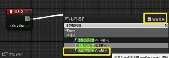 从鼠标X右侧的五边形输出端拉出输出端的线,松开鼠标会自动调出命令搜素,输入添加控制器,我们选择添加控制器Yaw输入。此时要注意勾选右上角的情境关联。鼠标X对应Yaw,鼠标Y对应Pitch。