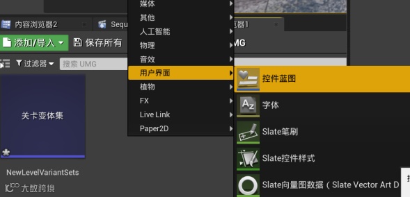 创建UI控件:右键点击内容浏览器,在“用户界面”里面选择到“控件蓝图”。控件蓝图便是悬浮在界面之上的UI控件。