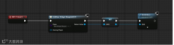直接右键控件的Return Value,选择提升为变量。此时会出现 SET 节点,此时左侧的变量页面新增了一个变量,我们将变量名称NewVar_0改为UMG。再从SET 的五边形输出端调出添加到视口,将SET 的圆形输出端输出给添加到视口的目标输入端。