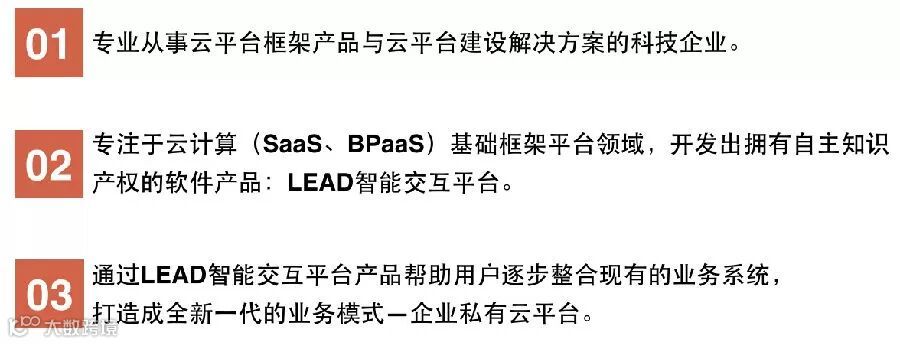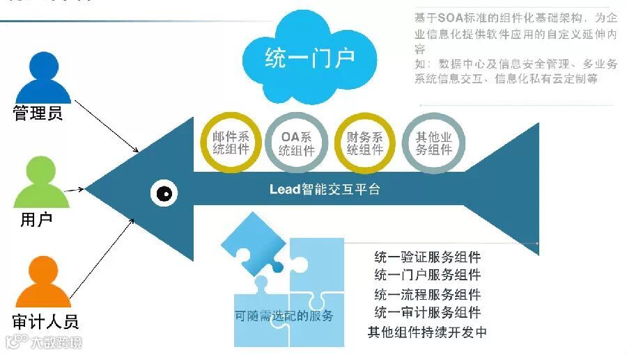 Lead智能交互平台采用基于SOA标准的组件化基础架构,为企业信息化提供软件应用的自定义延伸内容,如:数据中心及信息安全管理、多业务系统信息交互、信息化私有云定制等。)