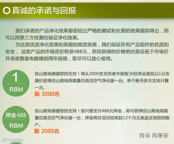 认投488元,优山美地感谢您的支持!您只要支付488元押金,即可获得优山美地高能量仿真花空气净化器一台,押金将在项目结束起12个月无息返还到您的账户。