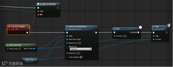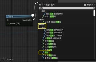 接下来的动画制作过程与前文的UMG调用过程相似,在此就不过多赘述,唯一要注意的是“延迟”链接的“控制”节点是pawn展开页下的控制节点。