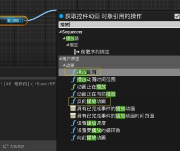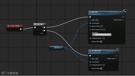 此时再切换到图表页面,在左侧变量下出现了新的动画变量。将动画直接拖到画面中,选择获取动画变量。分别调用出对应的“播放动画”与“反向播放动画”节点,并分别连接到Flip Flop的A与B上。