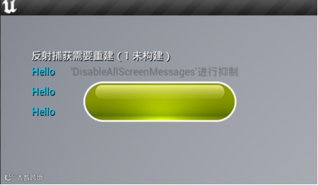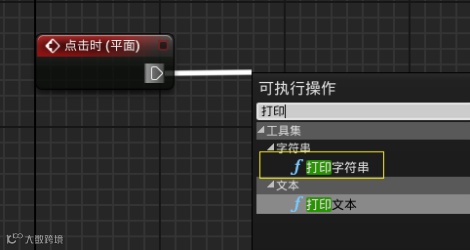 在按钮点击时的右方调出命令“打印字符串”,我们可以将字符串的内容修改成任意的测试文本。此时依次点击左上方的编译、保存、运行,运行该项目。此时点击按钮便会在左侧出来“打印字符串”里面的测试文本内容,这代表这该按钮的信号成功传输到“打印字符串”节点。