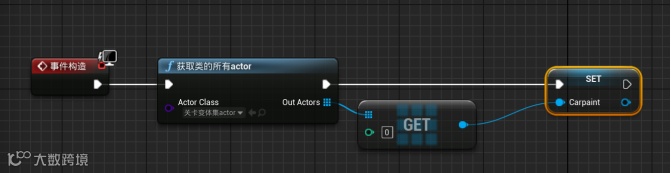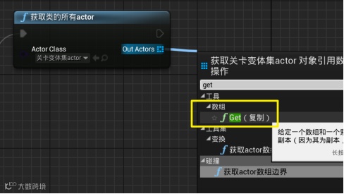 在“获取类的所有Actor”节点的Out Actors输出一个“Get(复制)”节点,如图2.3.2。再从Get节点提升为变量,如图2.3.3。
