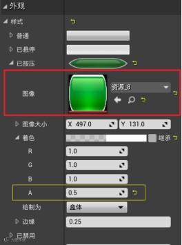 打开空间蓝图,在左侧控制板里的通用栏找到按钮,将其拖入到画布面板中。在右侧的插槽属性中将尺寸调整到与UI按钮适配的尺寸。在外观里面,“普通”、“已悬停”和“已按压”的图像都添加准备好的按钮,同时在“已按压”的着色A通道上降低一定的透明度,在按压的时候按钮的视觉效果上能起到一定的变化。