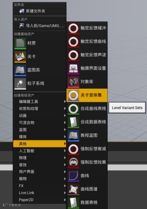 在内容浏览器中右键,调出其他-关卡变体集(Level Variant Sets)。
