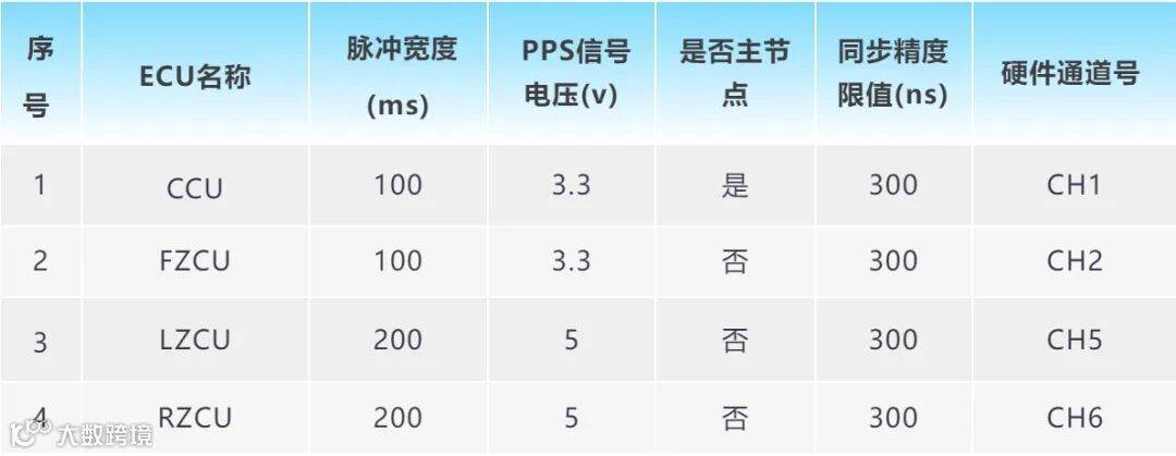 参与时钟同步的ECU在整数秒控制PPS硬件管脚输出PPS脉冲信号,比较从节点与主节点PPS信号上升沿的差值,即可得到各从节点的同步精度。