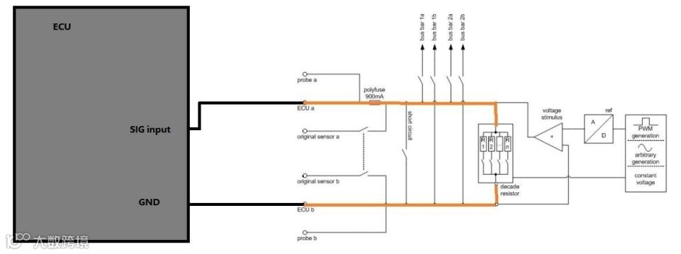 由电路原理图可知,当不同的开关闭合后,ECU 信号输入端接入不同阻值的电阻, VT2004A仿真模块可以提供1 Ω … 250 kΩ 的电阻输出,因此选用此板卡。