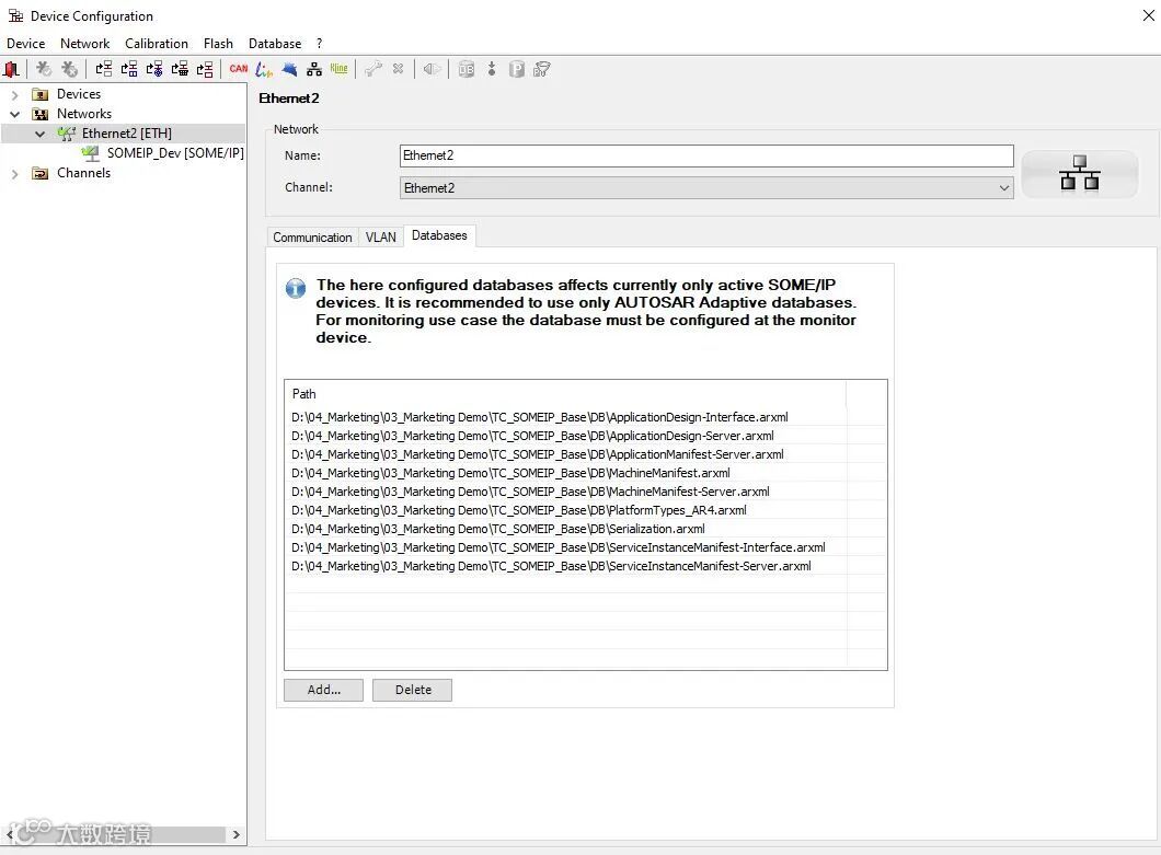 CANape作为客户端提供SOME/IP模块,可主动订阅SOME/IP Server提供的服务。只需要选择网络,设置IP地址,加载数据库等操作,即可完成SOME/IP设备的创建。标定和测量的操作与传统方式一样,不再赘述。