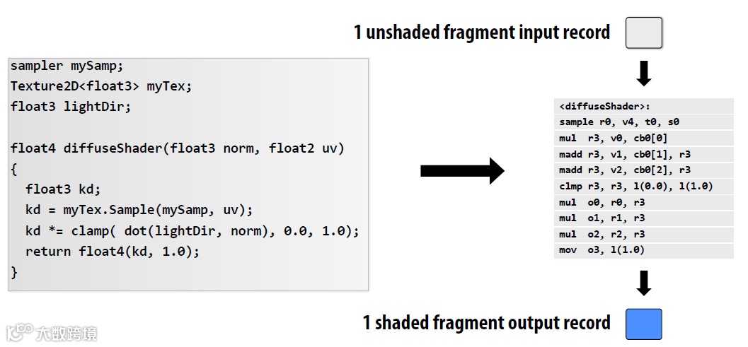 其中,可编程管线中最重要的两个Shader分别是Vertex Shader和Fragment Shader。下面给出一个例子,描述了片元着色程序是如何在GPU上执行的[3]。通过这个例子,相信大家能对可编程渲染管线有一个更深入的理解。