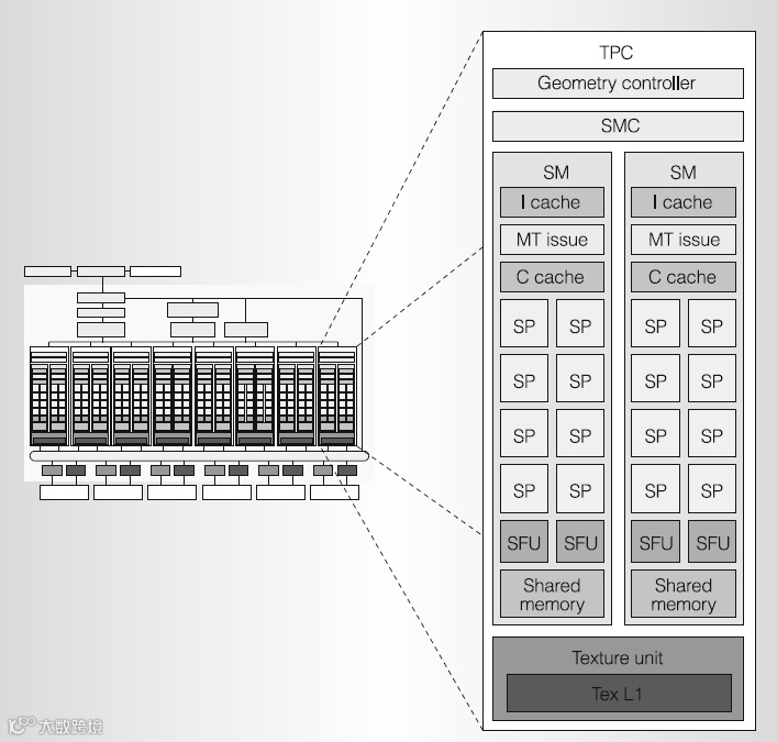 下方的Raster Operation Processors(ROPs),负责将TPCs产生的结果(颜色 / 深度)写入到framebuffer中。每个TPC除了包含2组流式多处理,还包含了其他功能单元如Geometry Controller,Texture(Texture Unit + Texture L1 Cache)等(图3)。