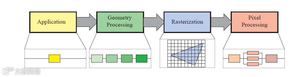 ▷ Application阶段在CPU端执行,通常用于准备绘制所需的几何数据、Uniform数据等,并发送给GPU端