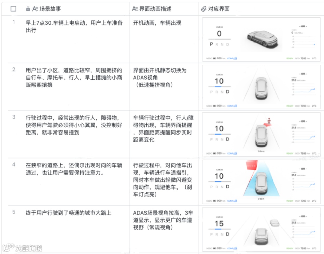 确定了静态界面设计后,便开始ADAS&APA动效制作部分。在开始设计之前,我们希望最终各个场景的触发都是可交互的,所以我们在设计之前便将不同的场景片段进行区分,最后输出成一个个可连续的片段。用户通过操作进行不同驾驶场景的切换,有利于更好的感受我们的设计。而视觉方面依据确认好的设计风格,将所有的操作以扁平UI结合3D车模的方式来还原驾车、泊车的各个场景,这样做的优势是简洁真实、清晰直观,代入感也更强,也能够更加高效的读取周围环境信息。以下挑选部分片段展示: