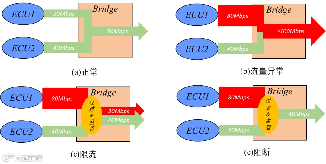 · 对于ECU1的异常数据流量,通常的做法是网桥的入端口对其进行限流(如图1(c))或直接将其阻断(图1(d))。