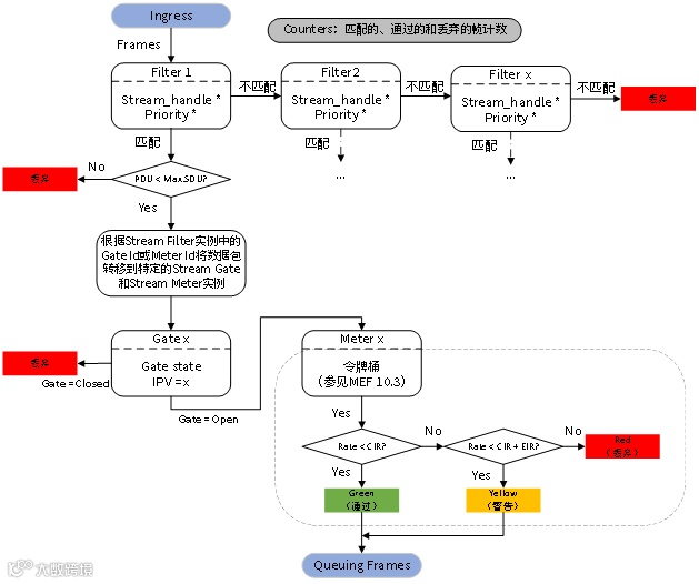 对于流过滤器,传入帧根据流过滤器中的Stream Id(与流识别得到的Stream_handle参数相关联)和priority参数匹配到对应的流过滤器,不匹配流过滤器的帧被丢弃。